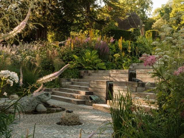 The beds on either side of the rill of water that flows down from one pool to the other are at their florescent best this month, like a slow firework of exploding colour and form. The waterlilies are in bloom, providing shelter for our newts, while mischievous toad sculptures are on hand to cool down little guests.