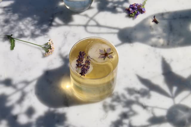 Garnish with edible flower ice, and a sprig of garden lavender.