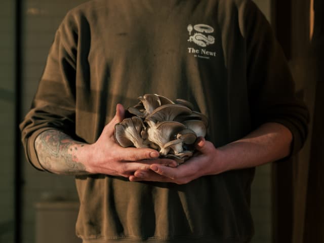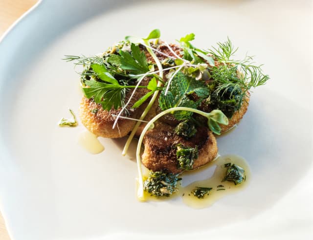 Try our delicious Newt twist on a classic ‘steak’, showcasing cultivated estate Lion’s Mane mushrooms and soft garden herbs .