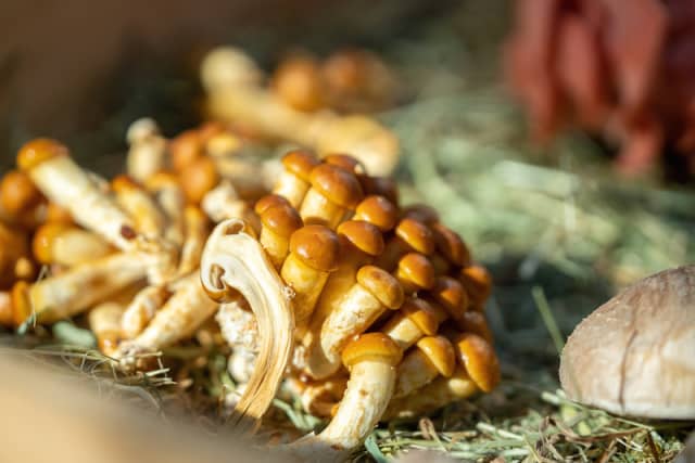 Light, temperature and humidity are all set to mimic the mushrooms’ natural habitat of the woodland floor, with an ambient temperature of 17 degrees and a compost temperature of 23 degrees. This allows us to consistently grow a range of varieties from the sturdy blocks of sterilised straw, which have been inoculated with different strains to feed the mushroom bunches as they grow