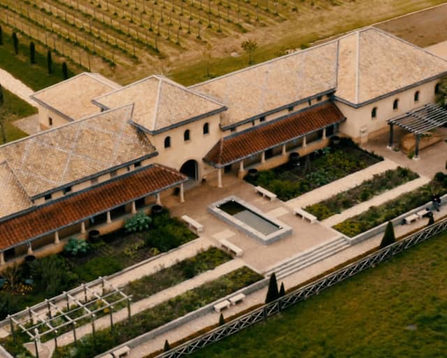 The reconstruction includes intricate mosaics and frescoes adorning walls and floors throughout. Outside, a meticulously researched garden scheme features a Roman style planted flower meadow, water ponds, vineyards, pergola garden and more.