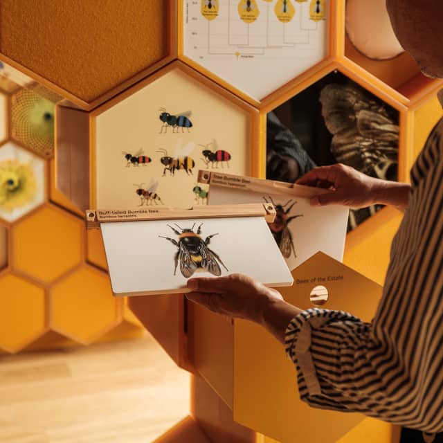 Step into our Beezantium, a scaled-up honeyed beehive, for a fascinating bee’s eye view of the world. Honeycomb walls feature educational panels for all ages and audio guides offer unique insight into the invaluable role our bees play in preserving the ecosystem, how we can help them in practical ways, and the intrinsic relationship between bees, the land and us humans.